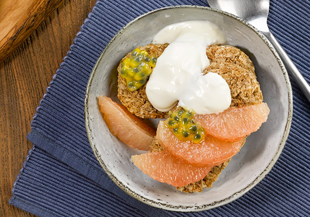 - Put two Weetabix in a bowl, top with yogurt, grapefruit segments and pips scraped out from the passion fruit and enjoy!